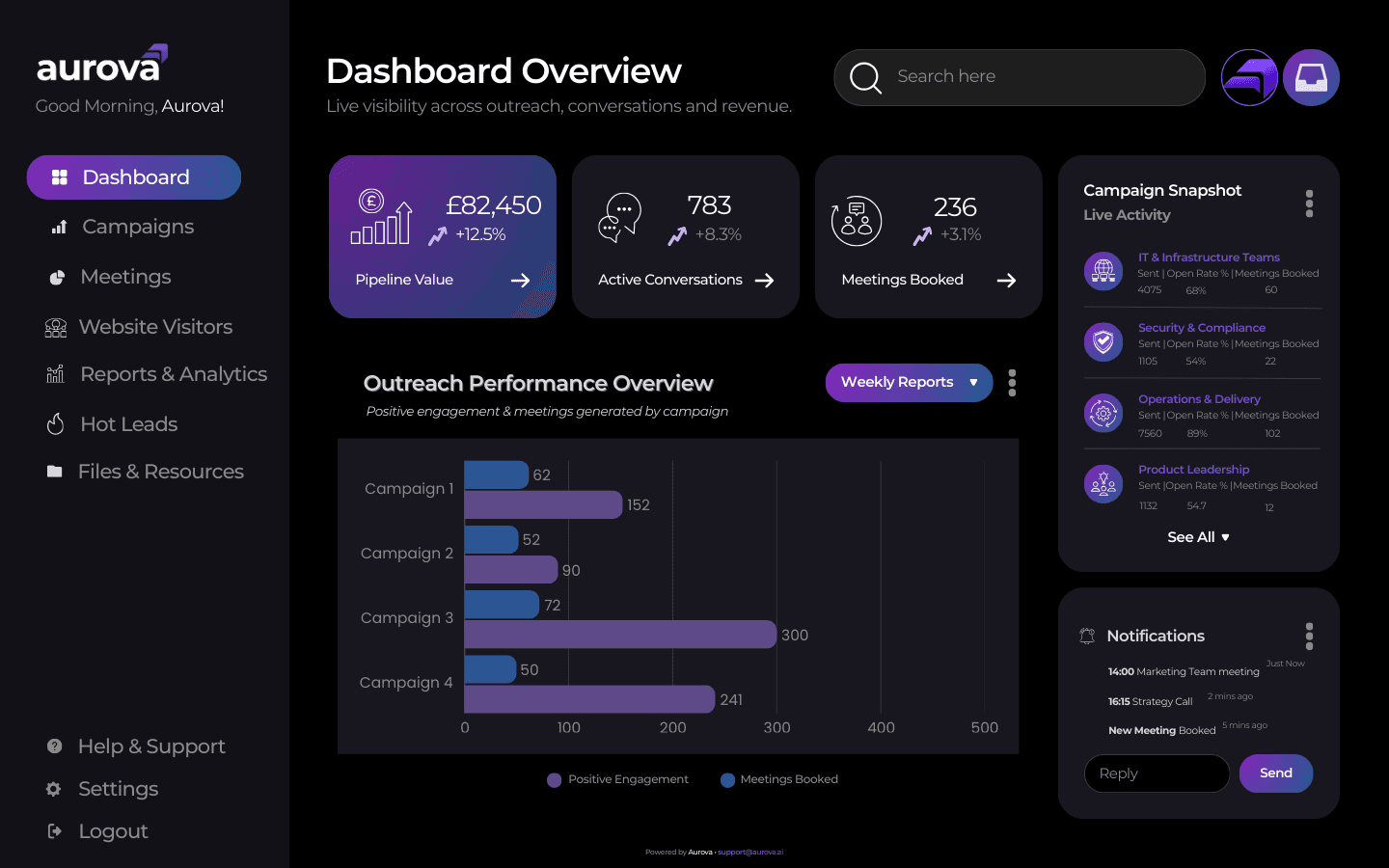 Yes. The Aurova Portal shows live activity across outreach, responses, pipeline movement, and performance.